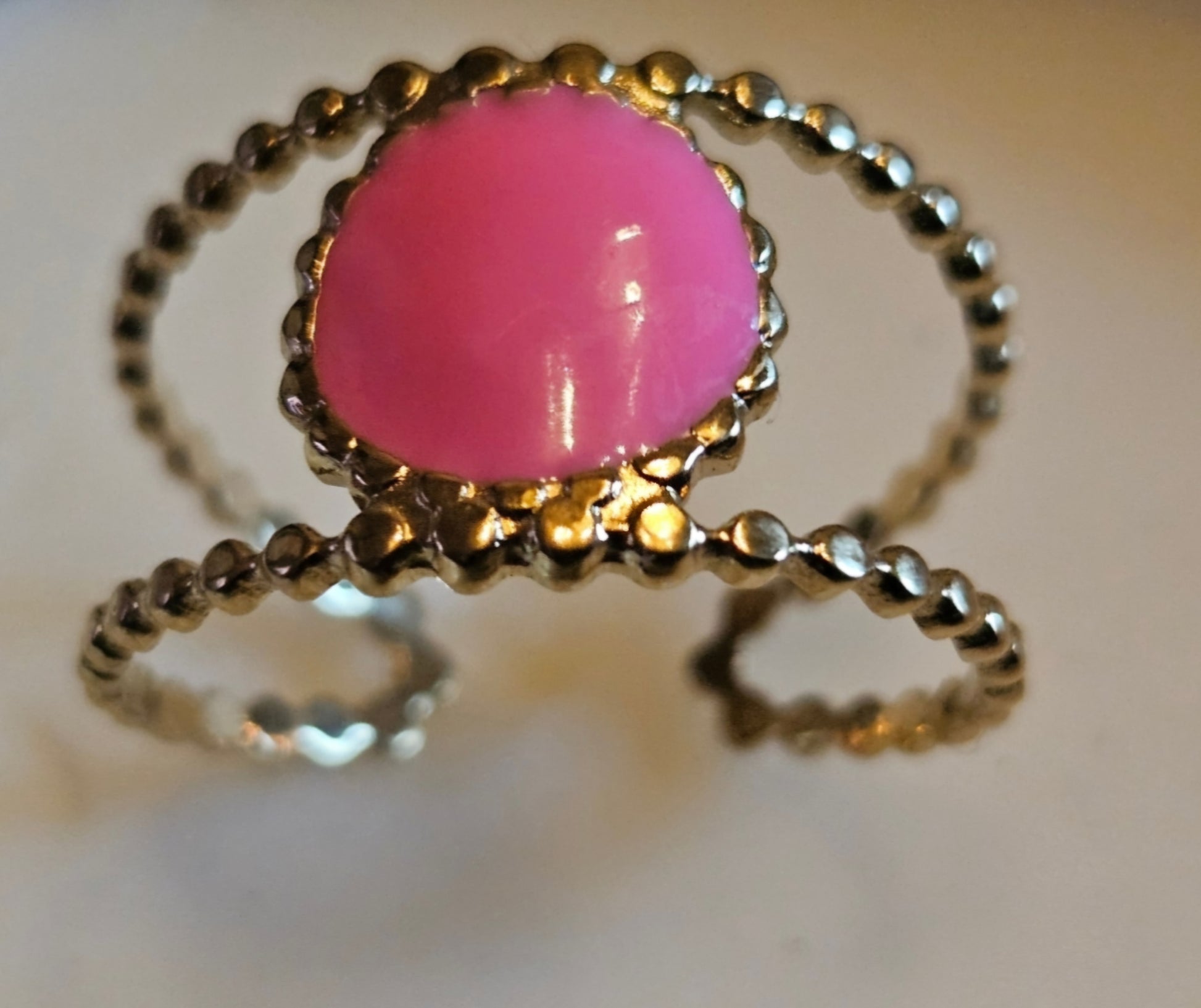 Douce et lumineuse, cette bague ajustable en acier inoxydable doré ornée d'un cercle rose verni a un charme délicat. Son design élégant avec ses anneaux ajourés perlés évoque un petit soleil au coeur de bonbon. Idéal pour ajouter une touche féminine et poétique à votre look.