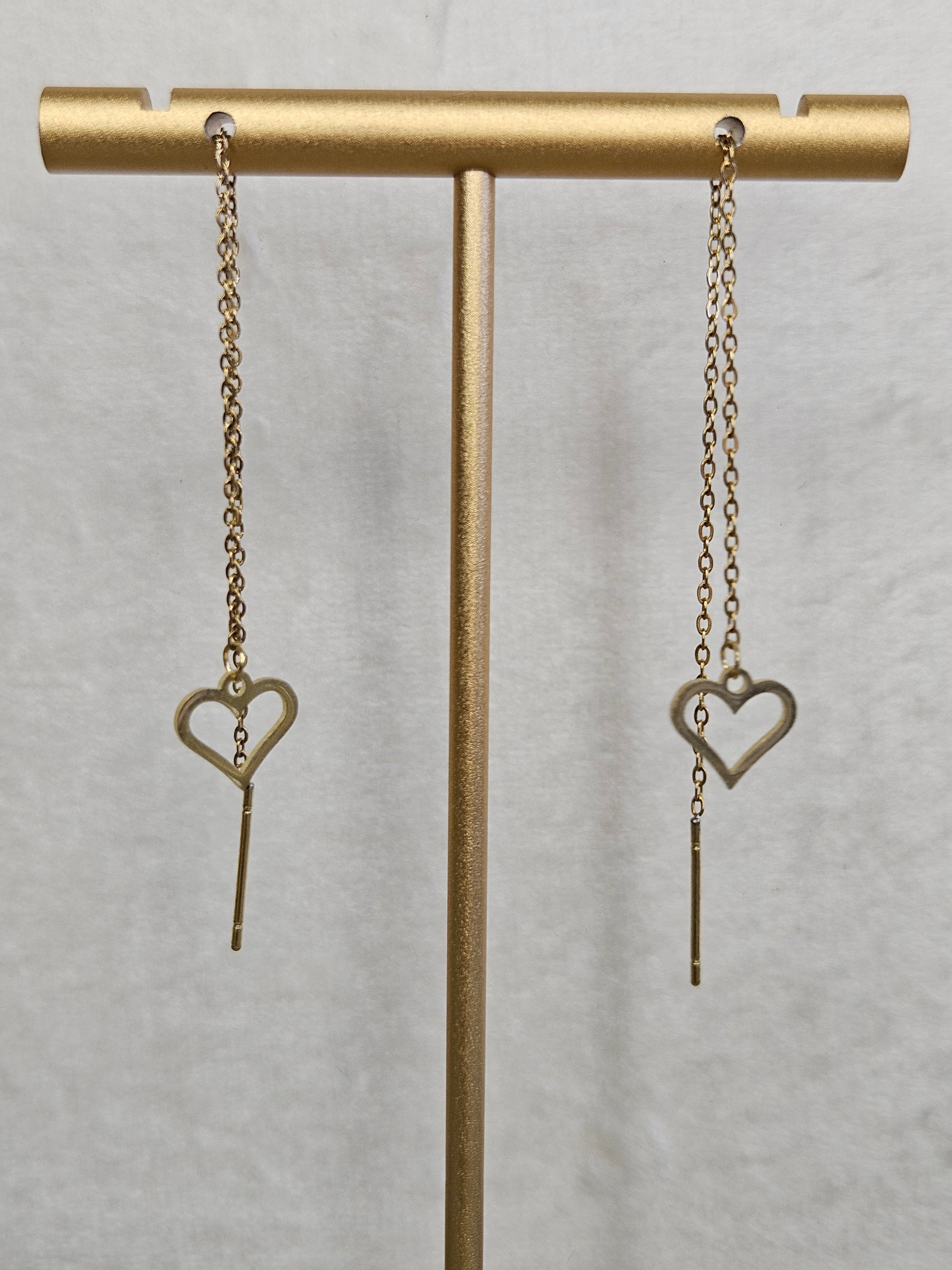 Chaque boucle est composée d’une fine chaînette dorée qui glisse délicatement à travers le lobe, terminée par un cœur suspendu en bas. Grâce à leur système à enfiler, vous pouvez ajuster facilement la longueur de la chaîne pour créer l’effet souhaité — plus court ou plus long selon votre style du jour.
