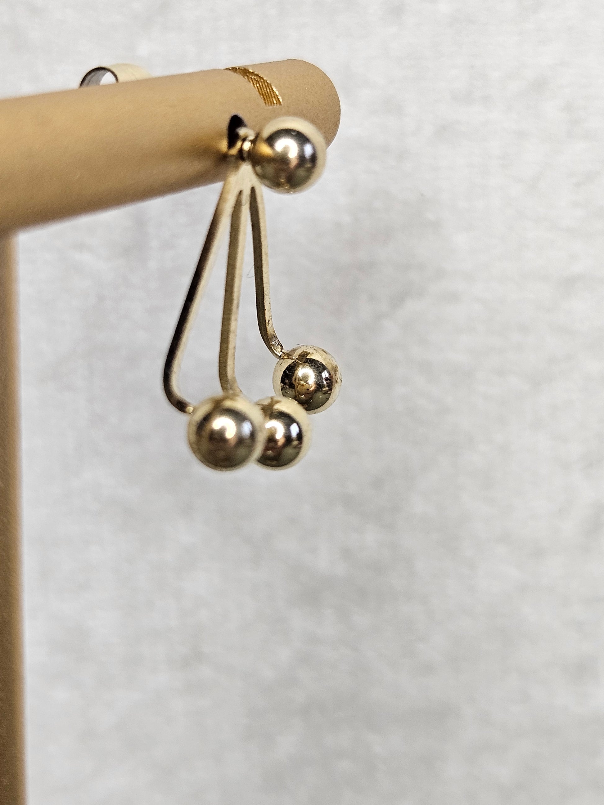 Ces boucles d’oreilles en acier inoxydable doré au design contemporain offrent un jeu de volumes unique et élégant. À l’avant, une boule lisse et brillante se pose délicatement sur le lobe, tandis que trois tiges fines partent de l’arrière pour passer sous l’oreille, chacune terminée par une boule dorée visible sous le lobe. L’effet est moderne, épuré et résolument chic.