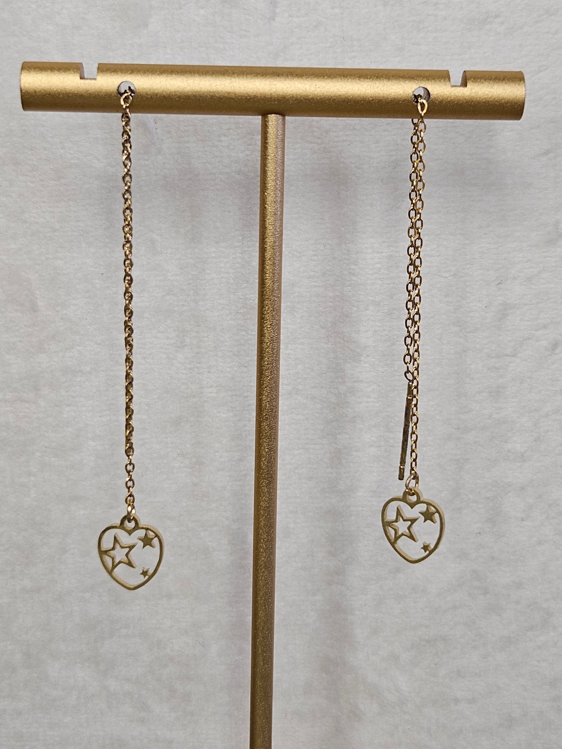 Une chaînette fine et lumineuse glisse délicatement à travers le lobe et se termine par un cœur ajouré ou plein, renfermant de minuscules étoiles scintillantes.
