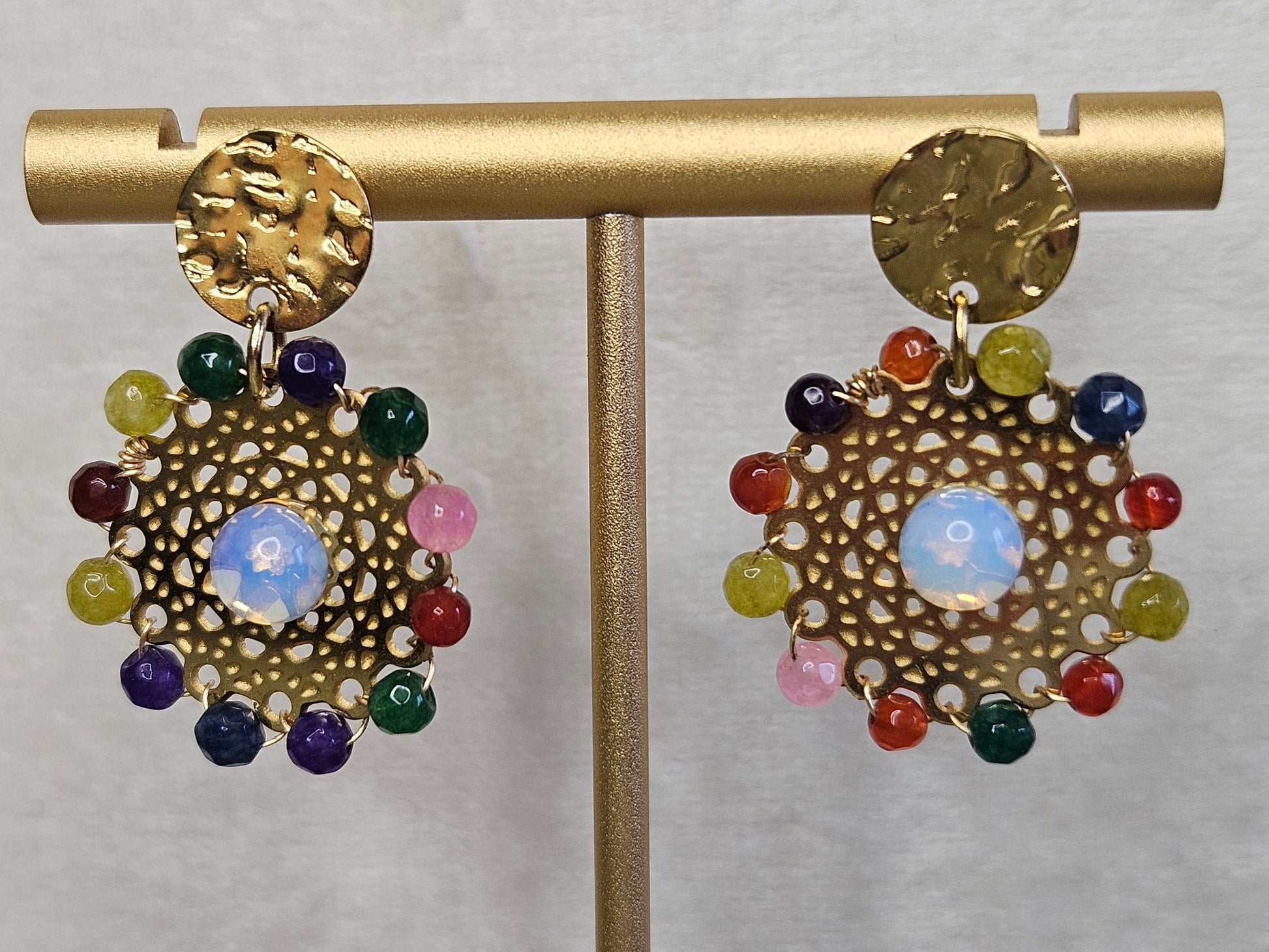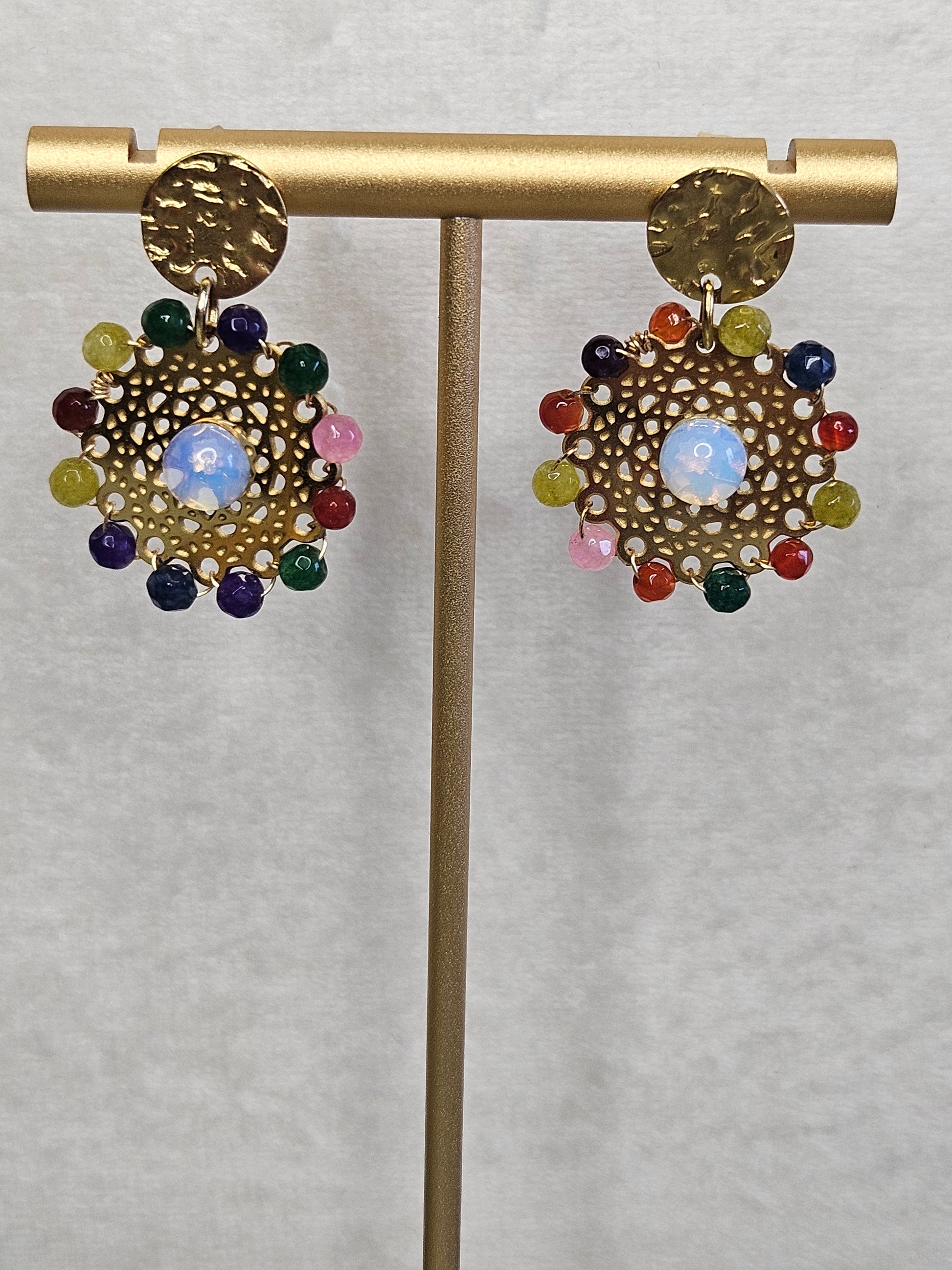 Osez la couleur et l'originalité avec ces boucles d'oreilles circulaires en acier inoxydable doré. Ornée d'un cabochon central opalescent, entouré de perles multicolores éclatantes, et avec une attache en acier froissé, elles allient style ethnique et élégance.