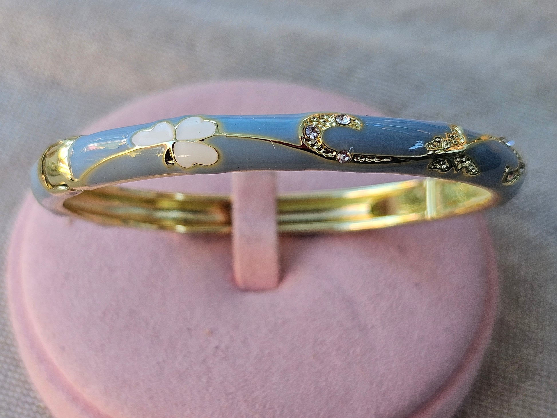 Ce jonc délicat, teinté d’un bleu pâle doux comme l’aube, s’orne d’un motif floral blanc entouré de feuillages gracieux. Des strass sertis viennent parsemer l’ensemble comme de fines gouttes de rosée, capturant la lumière à chaque mouvement. Élégant, poétique et lumineux, ce bijou évoque un souffle de nature enchantée, parfait pour celles qui aiment la magie discrète des détails.