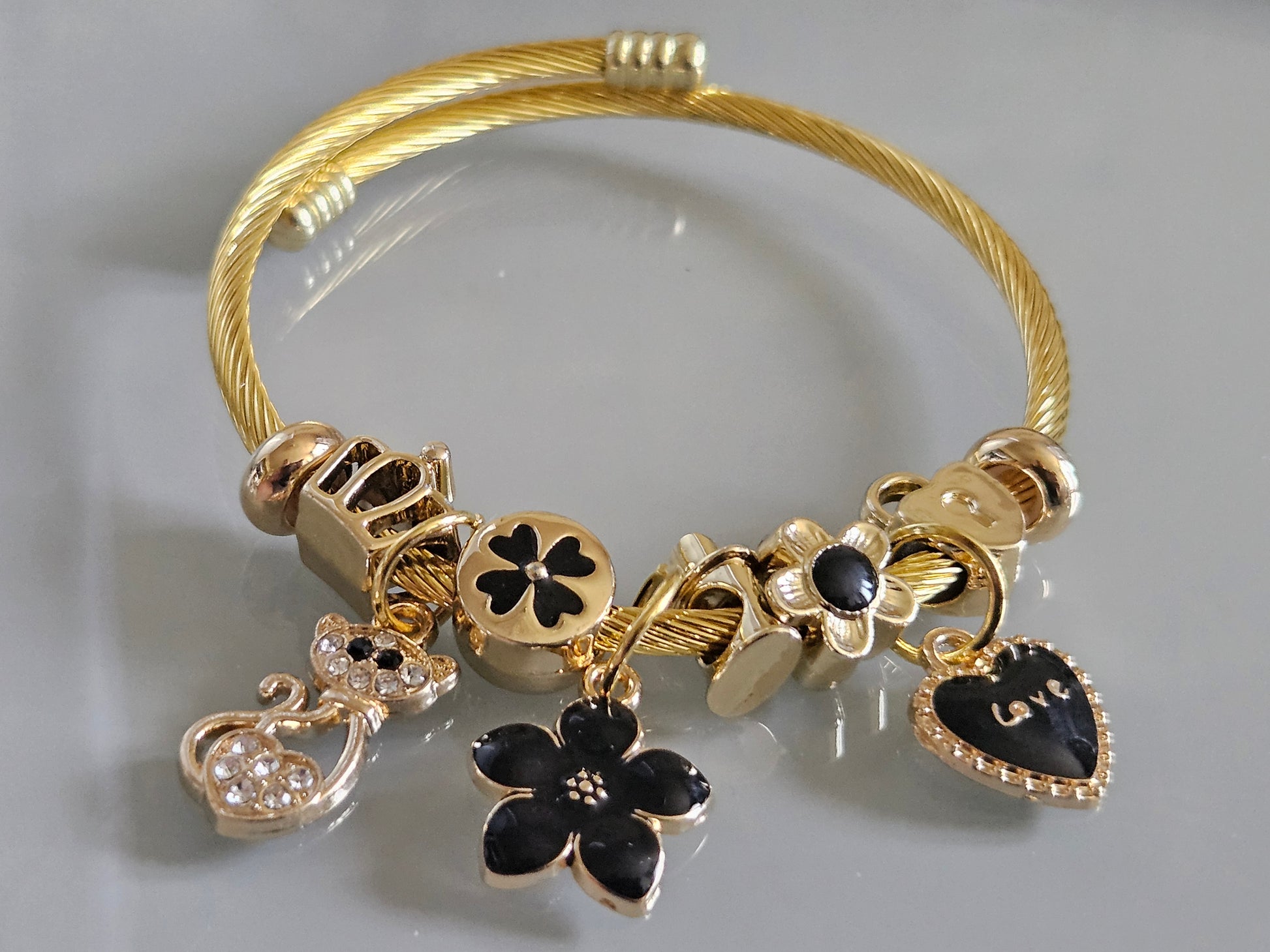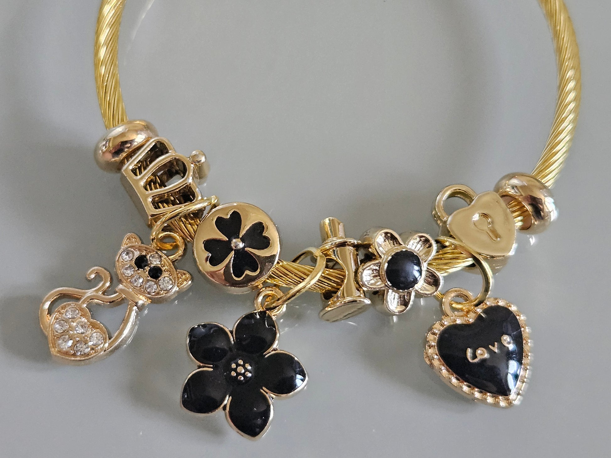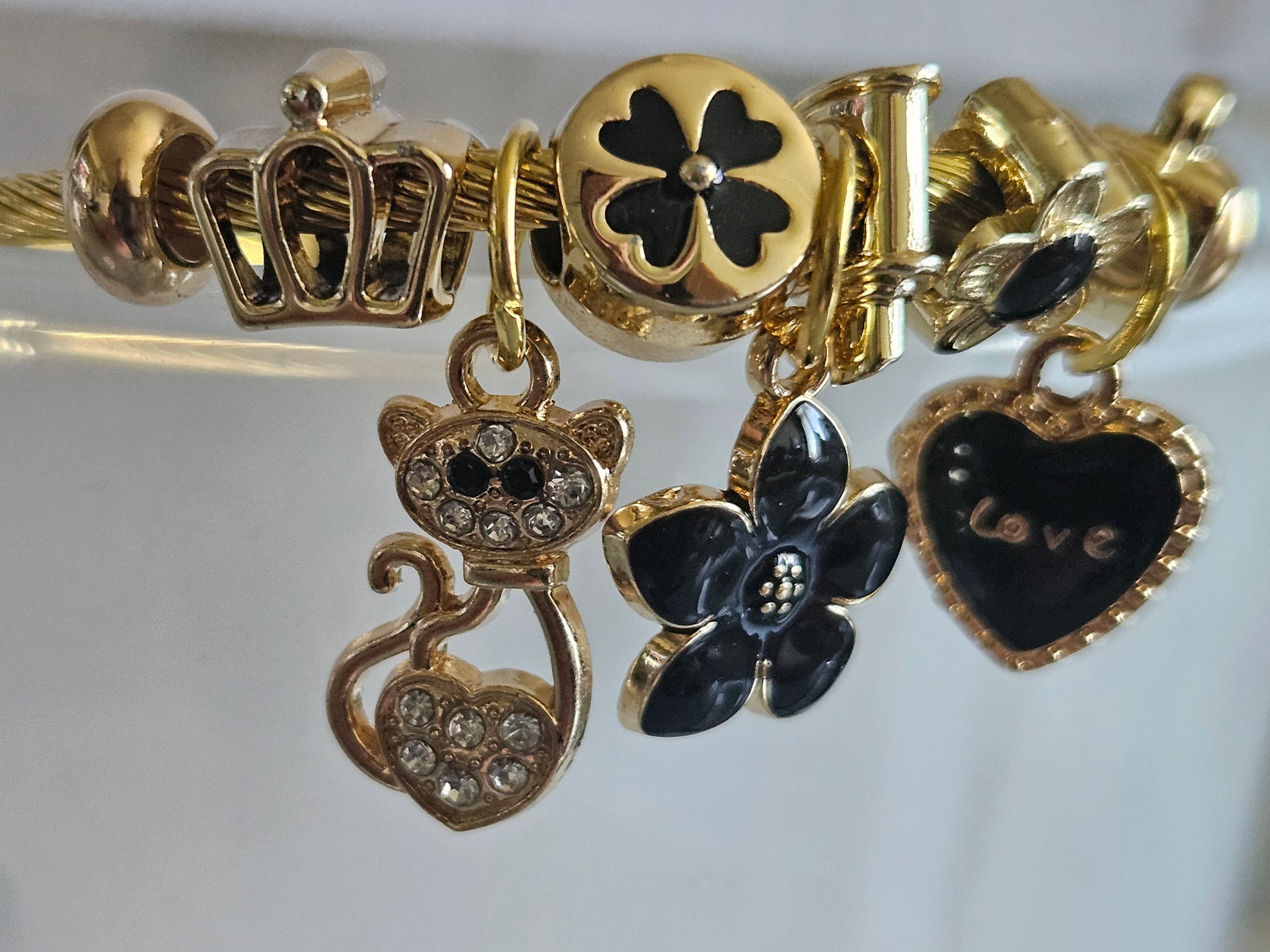 Laissez-vous séduire par ce magnifique bracelet doré, orné de charms à la fois tendres et audacieux, chacun porteur de sens et d’élégance.
