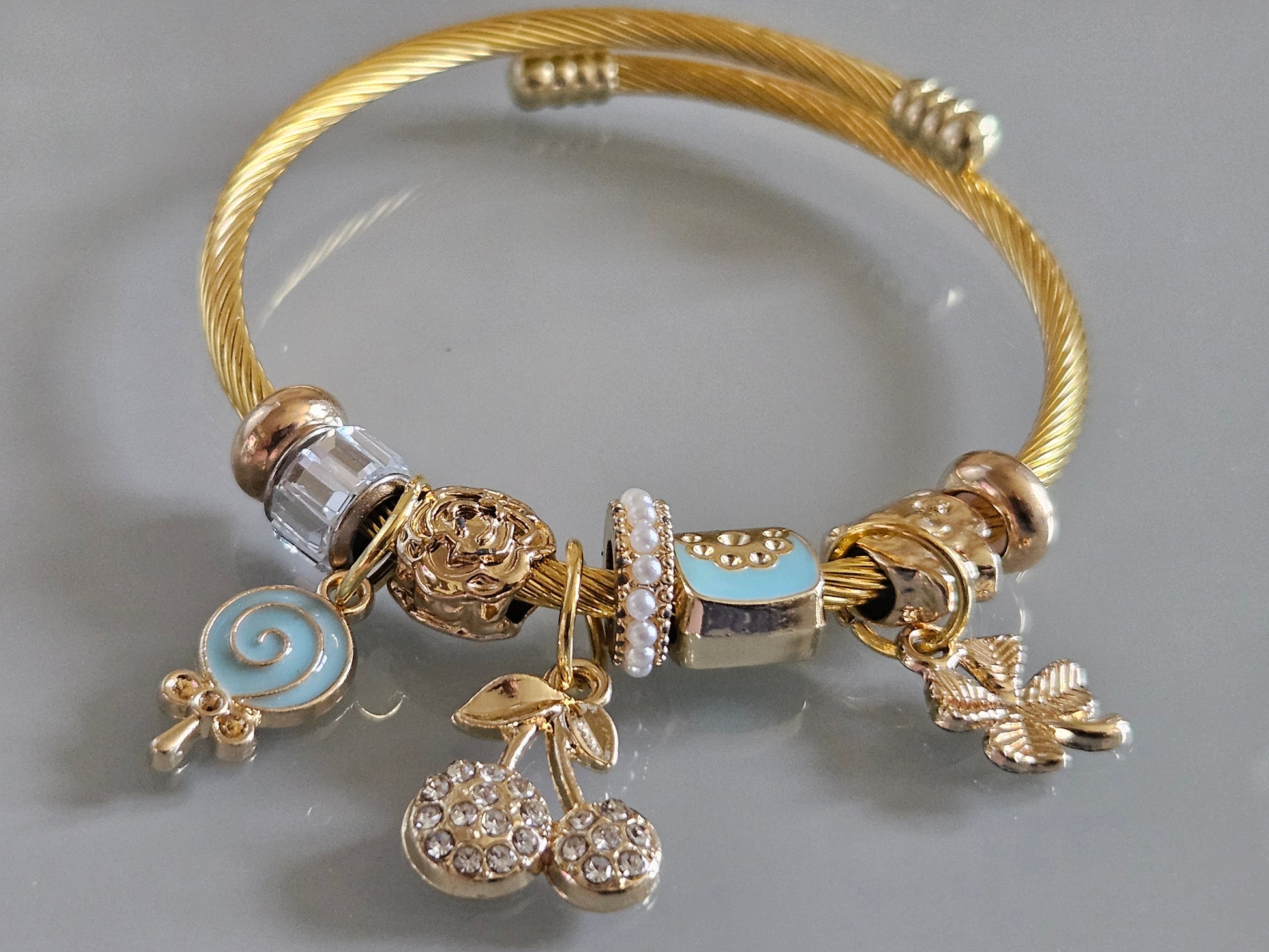 Monté sur un jonc torsadé en acier inoxydable doré, ce bracelet allie brillance, solidité et confort pour un port facile jour après jour.