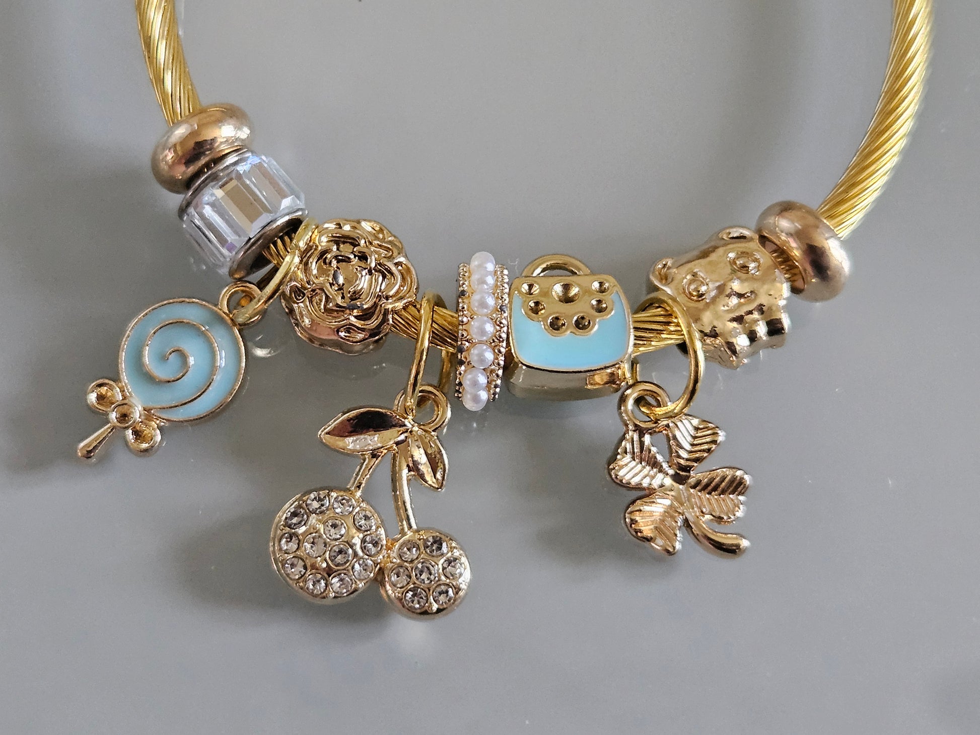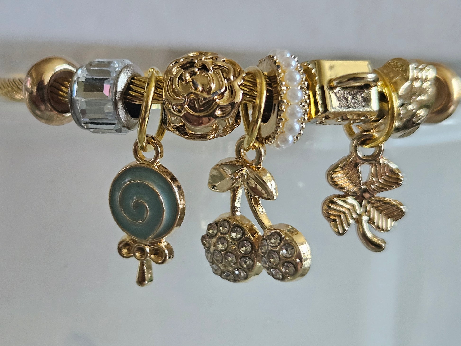 Succombez au charme espiègle et élégant de ce bracelet doré orné de charms enchanteurs aux détails soigneusement travaillés.