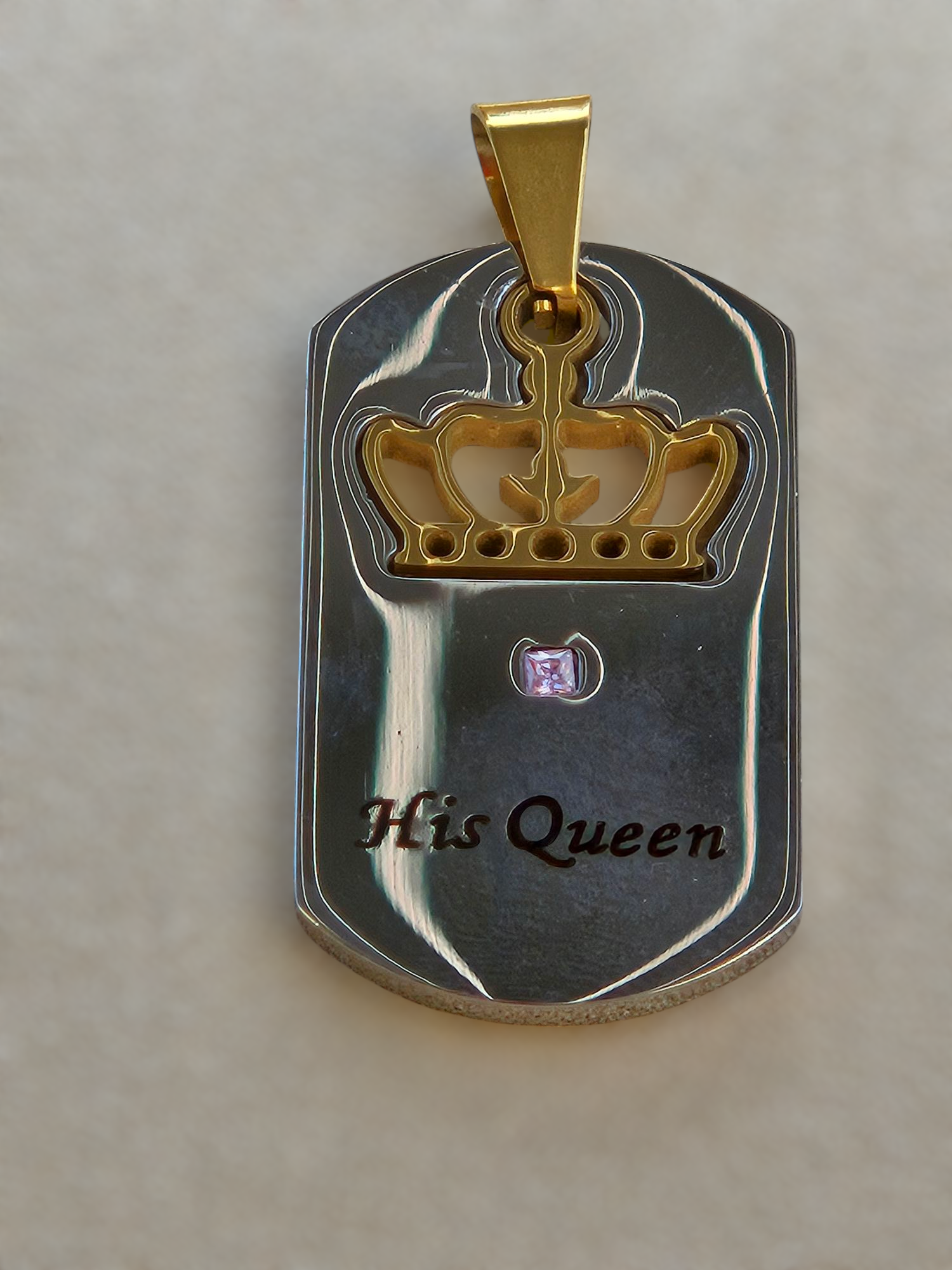 Ce pendentif en acier inoxydable argenté affiche avec grâce l’inscription "His Queen", surmontée d’une couronne dorée et d'un strass rose serti en écho parfait au pendentif "Her King". Délicat mais affirmé, il symbolise la loyauté, l’amour et la puissance douce d’une femme qui sait ce qu’elle vaut. Un bijou à la fois élégant et symbolique, pour celle qui règne dans son cœur — avec style et fierté.